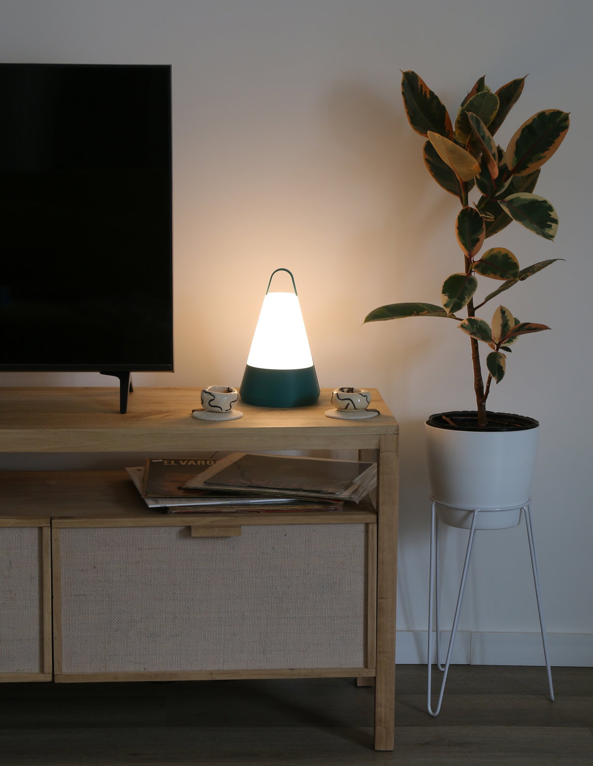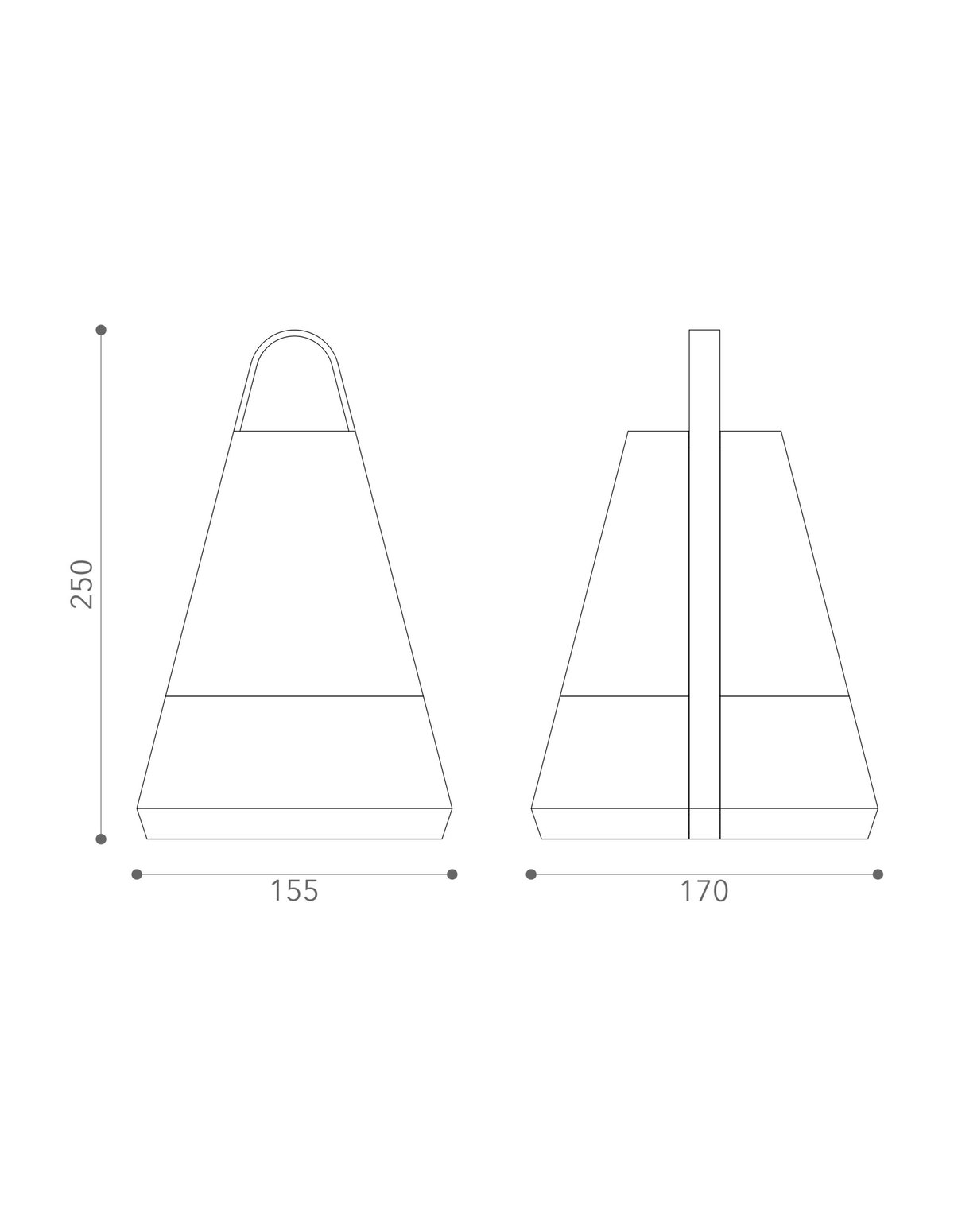 Lámpara de mesa minimalista de estilo contemporáneo. Su forma cónica y su cinta envolvente definen su personalidad y facilitan su manejo.